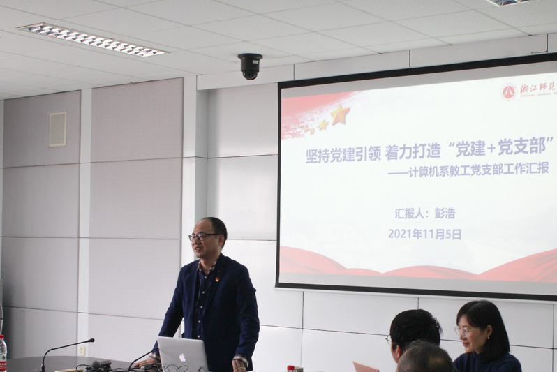计算机系教工党支部是我校基层党建工作“样板党支部”培育创建单位。支部书记彭浩从坚持党建全面引领,形成“党建+”特色样板;健全系部党政融合,夯实系部中心工作;注重学习更新理念、追求卓越工作绩效三方面进行了总结汇报,展示了创建成效。