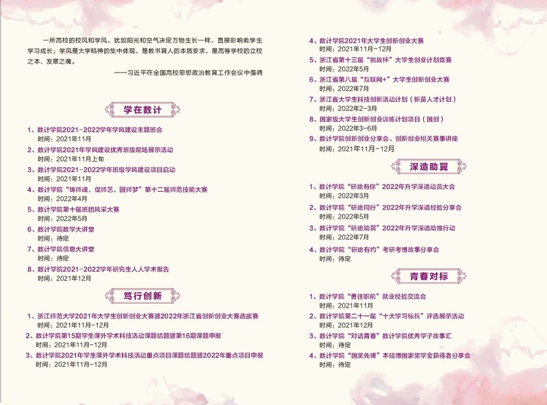 高质量人才培养是推动学院“十四五”规划落实,实现事业高质量发展的重要指标,而高质量人才培养关键又在于高质量学风建设。为进一步优化我院学风建设,营造“勤学、好学、会学、乐学”的学习氛围,“学在数计,风正时济”学风建设主题活动已经拉开帷幕,活动以学生全面发展为出发点,以学风建设质量提升行动、升学深造助翼行动、创新创业优化行动和青春对标同行行动等“四大行动”共同推进,全方位抓严、抓实、抓深,助力我院学子成长成才。风已扬起,帆已立起,风正时济,精彩等你一起!