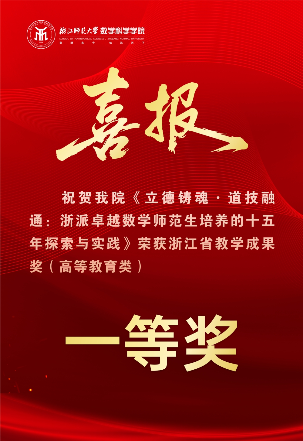 近日,浙江省教育厅正式公布了2025年浙江省教书育人杰出贡献奖名单。由我院作为第一完成单位申报的《立德铸魂·道技融通:浙派卓越数学师范生培养的十五年探索与实践》喜获浙江省教学成果奖(高等教育类)一等奖,实现了数学学科在该奖项上的新突破。