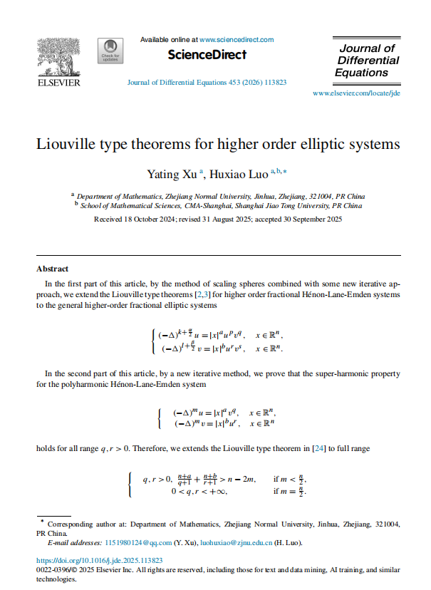 近日,数学科学学院2022级硕士生徐雅婷(现在复旦大学读博)与其导师罗虎啸副教授合作的论文Liouville type theorems for higher order elliptic systems在微分方程领域国际知名学术期刊《Journal of Differential Equations》(数学A* 期刊)上在线发表,浙师大为第一完成单位。