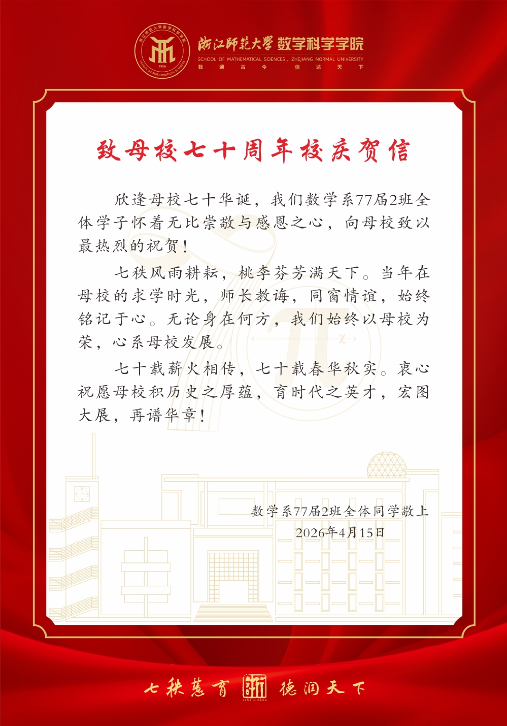 数学77届2班致母校70周年贺信